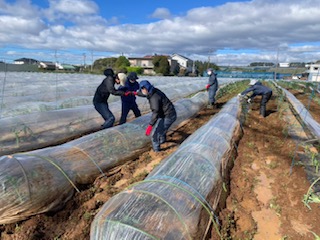 先日の悪天候ではがれてしまったビニールハウスを直しています!